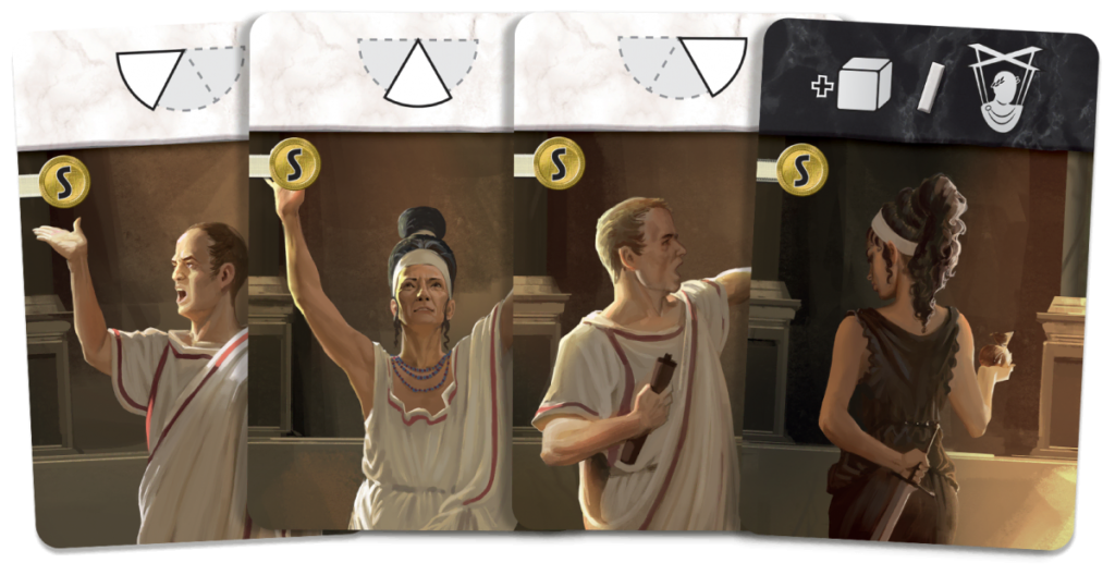 Dans un Sénat, il faut des Sénateurs. C’est donc un nouveau type de cartes qui fait son apparition. Leur coût est « S ».. à savoir que chaque nouveau sénateur coûte un nombre de pièces d’or égal au nombre de sénateurs déjà possédés. (en gros le 1er est gratuit, le second coûte 1, etc … bref, plus tu veux de l’influence au Sénat, plus ça te coûte cher).