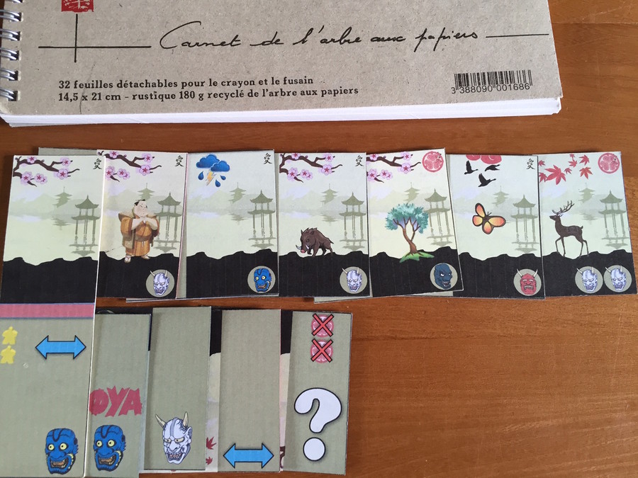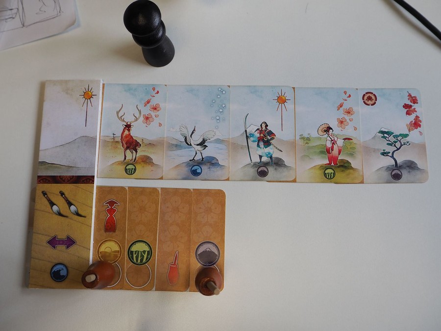 Et pour le commerce, il me vient une idée.. et si, plutôt que de collectionner des ressources usuelles telles que le riz, sel, minerais, on matérialisait les ressources par… des cartes de type hanafuda… permettant d’évoquer le rythme des saisons. Permettant d’introduire une vraie dose de poésie asiatique dans un jeu assez mécanique. Serge ne connaissait pas le Hanafuda, mais lui aussi mais il est lui aussi tombé immédiatement sous le charme de ces cartes évocatrices. Ensemble, nous avons donc conçu un deck de carte à la fois personnel et proche du Hanafuda traditionnel, avec des combinaisons adaptées à nos besoins