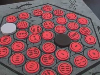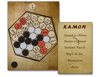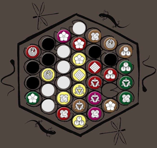 j’ai un petit prototype de jeu abstrait pour deux joueurs qui marche super bien. Ce pur jeu de connexion s’appelle KAMON. En effet, pour différencier les pions sur le plateau, plutôt que de m’appuyer sur des formes géométriques traditionnelles, j’ai préféré utiliser les KAMON des familles médiévales japonaises (l’équivalent de nos armoiries européennes). Le jeu est signé chez Jactaléa, et se verra publié sous une forme assez luxueuse, avec plateau en cuir. Les kamons de mon prototype laisseront la place à des formes plus animalières. Ce qui fait que le nom du jeu ne sera plus en rapport avec son design. A noter que la version Online, sur boite à jeux, conservera les kamons du prototype initial.
