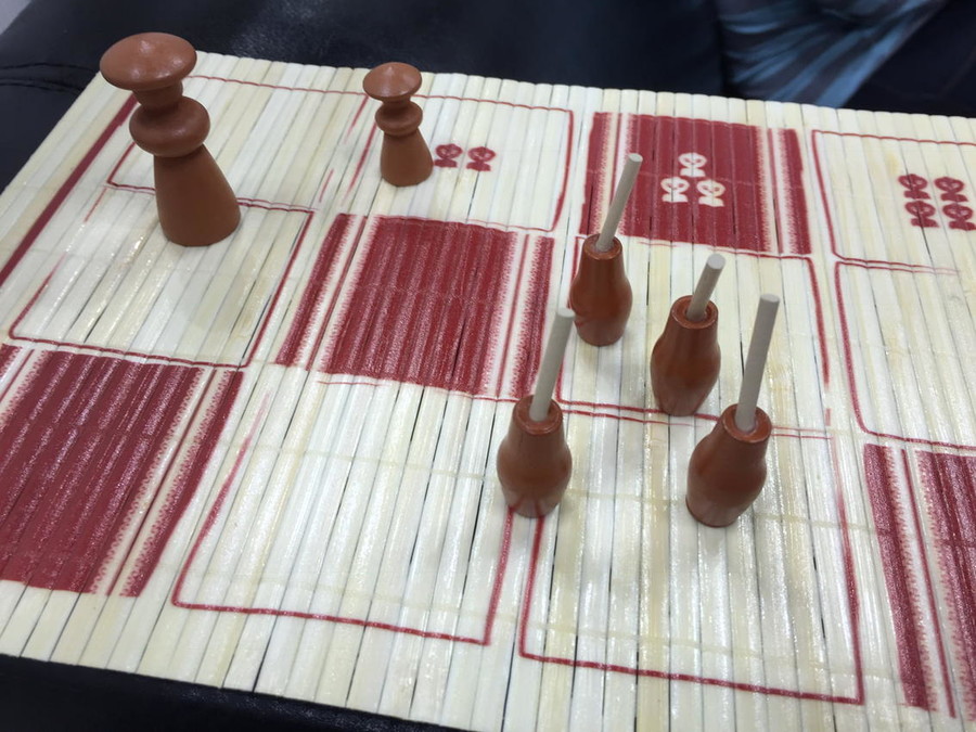 vec en prime un petit plateau central en bambou, des jolis pions en bois pour le Maître et son Disciple, ainsi que des pinceaux dans leur pot de peinture pour matérialiser les compétences des apprentis dans leur atelier.