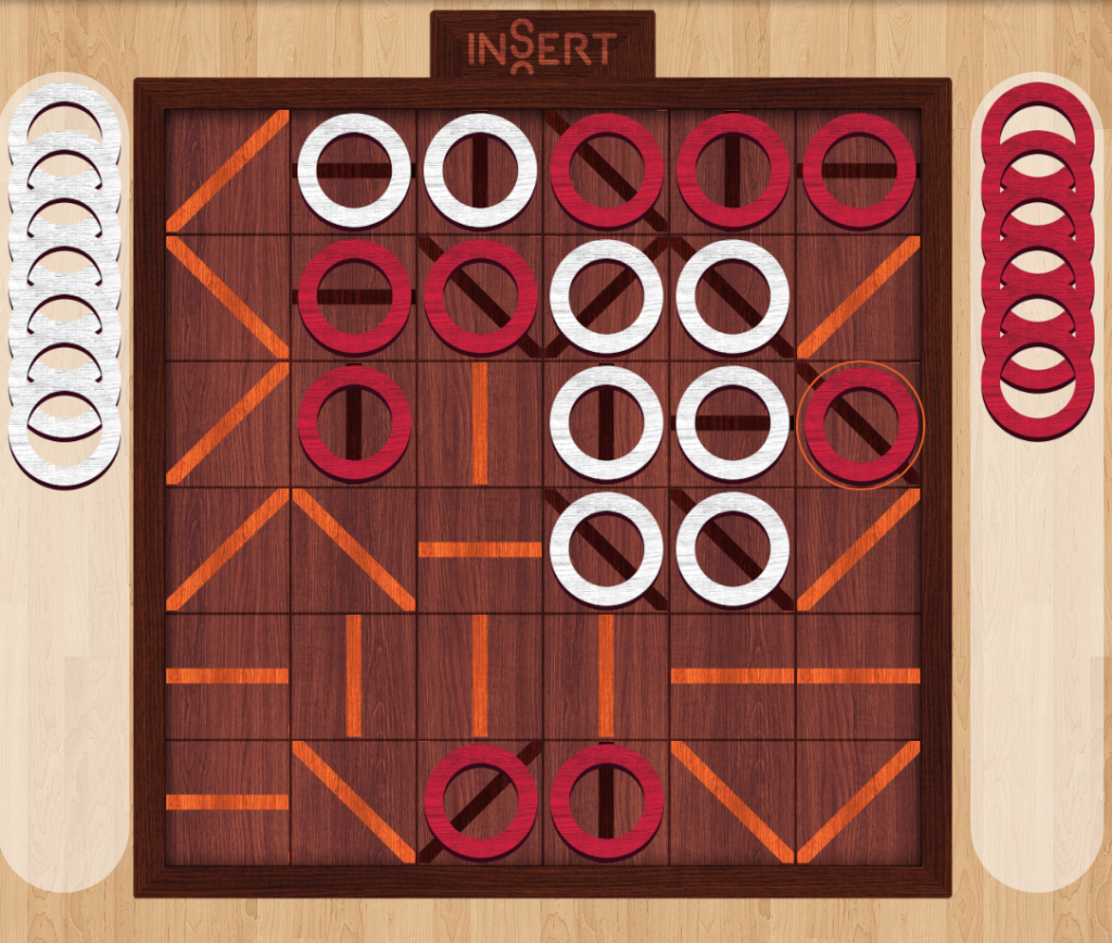 Je n’ai jamais joué à ce jeu, mais je me souviens très bien de ma lecture de l’époque. J’ai été intéressé, fasciné par le système de prise: en effet, dans ce jeu, la prise se fait par insertion. Il suffit de déplacer un pion à sa couleur au milieu d’une ligne de pion adverses, et tu prends TOUS les pions adverses. J’avais trouvé ça hyper malin, original, et depuis, je me suis toujours dit que c’était dommage / étonnant que ce système d’insertion n’ait pas été plus utilisé pour des jeux contemporains.