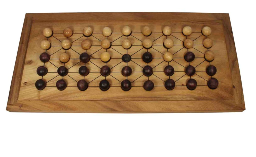Forcément, un retournement par encadrement, comme à l’Othello, aurait été possible. Mais… quel intérêt, finalement, de faire un jeu qui n’aurait finalement été qu’une variante de l’Othello. La seule différence se situant alors sur la contrainte de jeu. J’ai cherché. Et mes souvenirs des anciennes lectures de l’encyclopédie évoquées au début de cet article ont refait surface. Un jeu, un vieux jeu abstrait pour deux joueurs, un jeu malgache, s’est rappelé à mon bon souvenir: