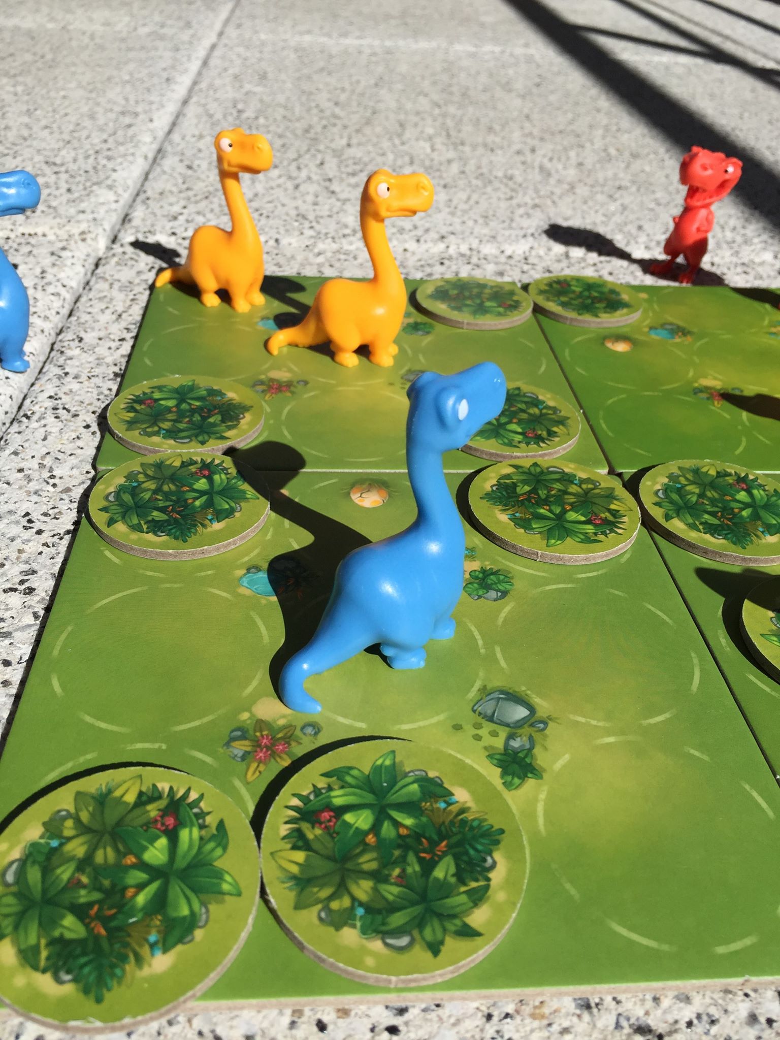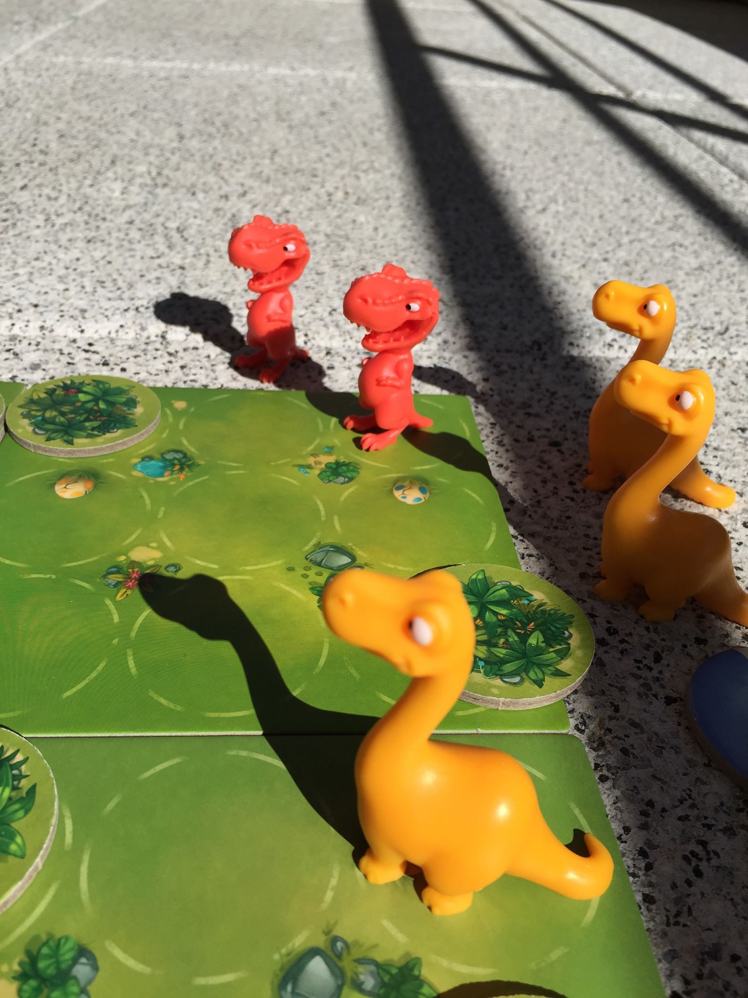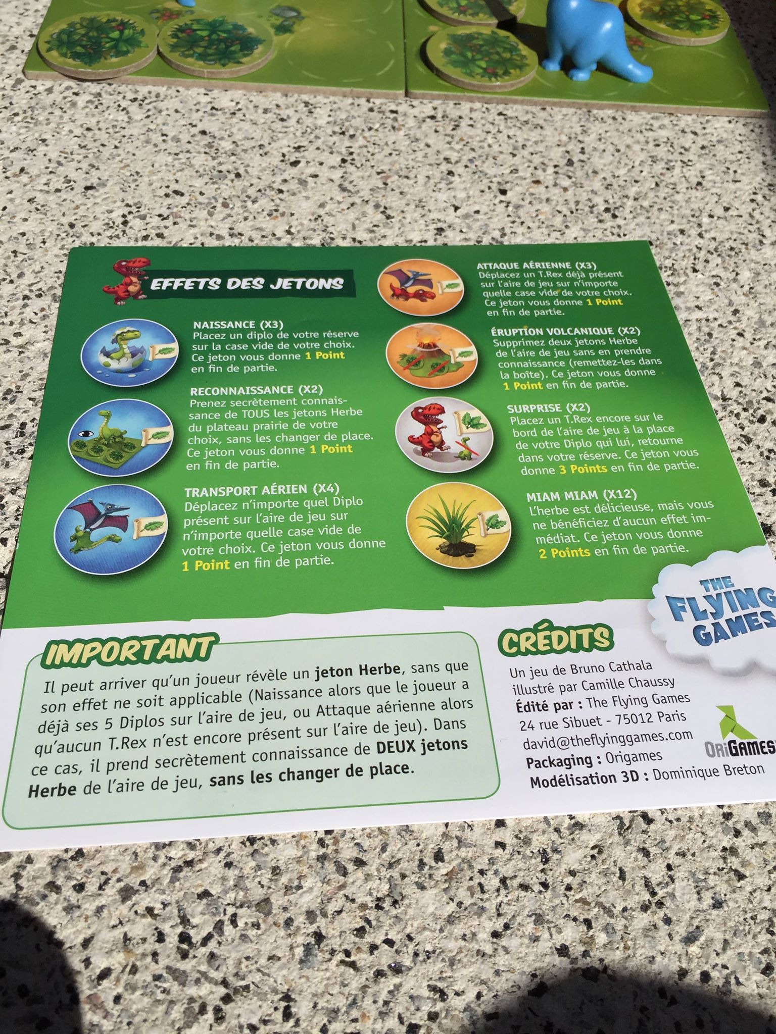 - Le matériel, bien sûr, superbement mis en image par Camille Chaussy, avec des jetons au carton bien épais, et ces figurines de dinosaures, diplos et Trex, tellement mignonnes