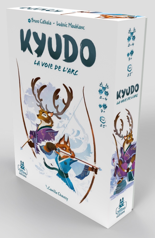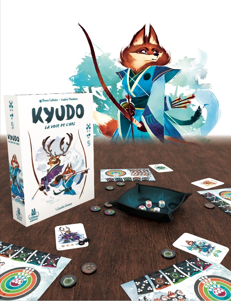 Dans Kyudo, les joueurs incarnent des archers participant à un concours de tir. Et vont en permanence devoir faire des choix cornéliens entre tenter de « fermer sa cible » (c’est à dire avoir réussi à atteindre tous les emplacement pré déterminés) et « faire fuir les spectateurs adverses » (quand on a terminé une couleur de sa propre cicble, si on continue à le viser, alors on fait fuir des spectateurs chez tous les adversaires n’ayant encore pas terminé cette couleur).