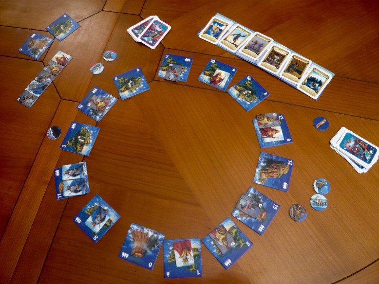 C’est cette fois-ci en compagnie de mon compère Bruno Faidutti que je suis reparti explorer les possibilités offertes par la disparition. Avec une thématique parfaitement en adéquation avec le concept mécanique : le jeu se passe dans le grand nord, et la banquise fond peu à peu. Deux à quatre joueurs vont lutter, à la tête de leur tribu d’esquimaux, pour prendre le contrôle des morceaux de banquise restant solides, et aussi pour se procurer plus de nourriture que leurs adversaires.