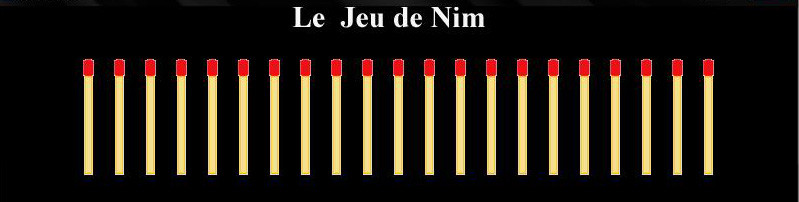 – Le jeu de Nim, lui aussi d’origine très ancienne, et répandu sur tout le globe sous des appellations diverses (fan-tan en Chine, Tiouk tiouk en Afrique), est construit sur le concept de disparition. Ce jeu est plus connu chez nous sous le nom de « jeu des allumettes ». On verse un paquet d’allumettes sur la table. Chacun des deux adversaires va retirer, à son tour, 1, 2 ou 3 allumettes. Celui qui es obligé de prendre la dernière a perdu.