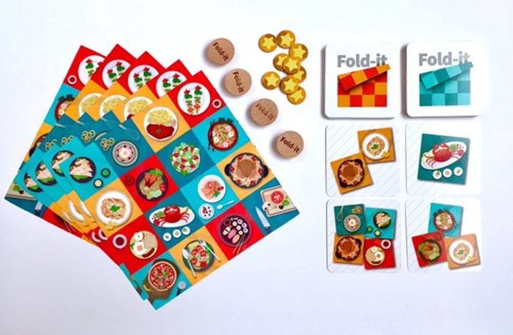 Je m’explique, dans Fold it, on retourne une carte et tout le monde tente de réaliser le MEME pliage. Seul le dernier à réussir subit une pénalité. Là, j’ai imaginé que les joueurs pourraient avoir la possibilité der réaliser un pliage parmi 4 possibilités. Certains challenges sont plus faciles que d’autres, mais font avancer moins loin. Et puis aussitôt qu’un joueur réalise un de ces challenges, il s’en empare, le retirant du champ des possibles pour les autres.. qui vont devoir changer leur fusil d’épaule.