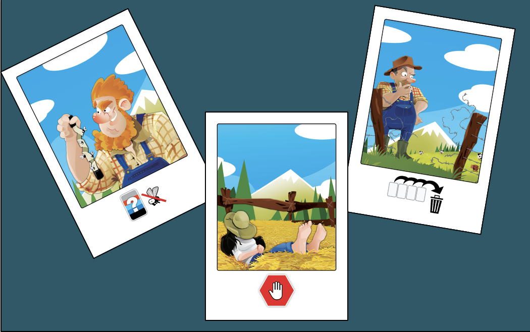 - Et surtout.. les cartes FERMIERS: A la fin de chaque manche, le joueur qui prend le plus de mouches sur cette manche reçoit une carte fermier qu’il pourra utiliser plus tard, au moment opportun pour… déclencher un effet utile, rigolo et sympathique.