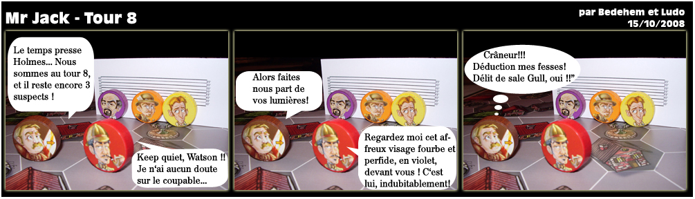 Mr Jack fait des bulles – épisode 7 Et voilà les deux derniers strips, qui clôturent nos délires autour des personnages de Mr Jack, créés en 2008 avec Ludovic Maublanc.. Le problème, c’est que ça donne envie de s’y remettre… 11 octobre 2014 Bulles Comments are closed Bruno Cathala
