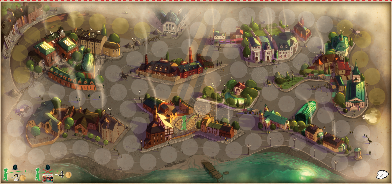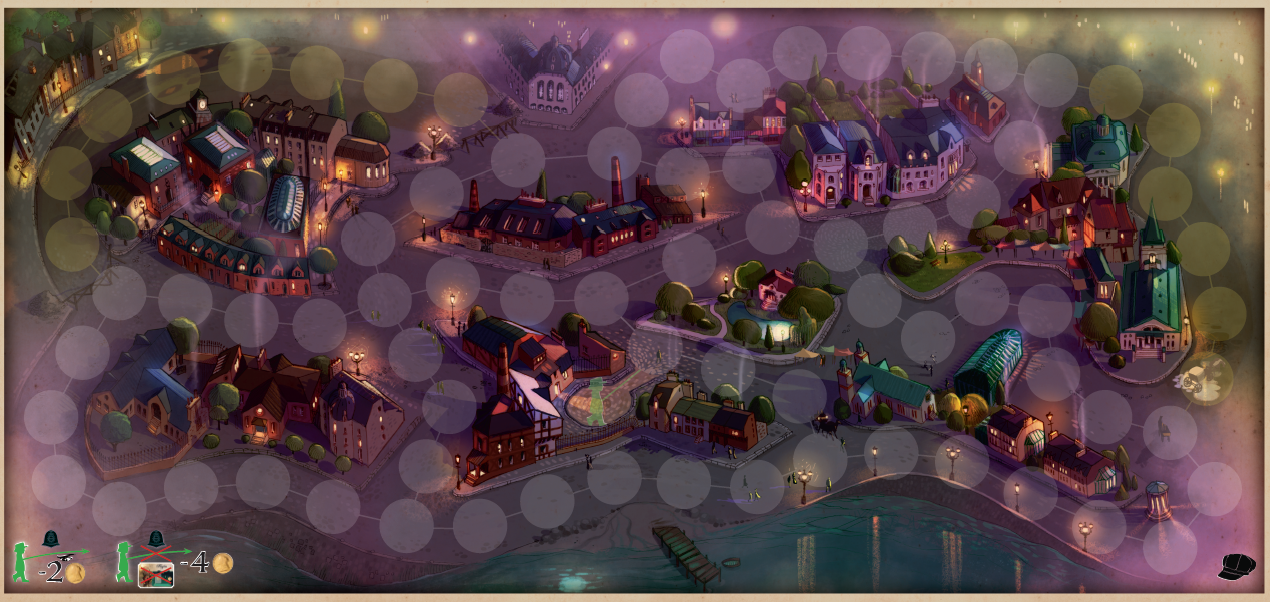 Les cartes sont devenues des objets que les enfants des rues (les joueurs) doivent collecter (un peu en mode pacman) sur un plateau recto (côté jour) verso (côté nuit) représentant le Londres de l’époque victorienne. Leur objectif est de ramener le résultat de leurs larcins à l’ignoble Fagin (il a vraiment une sale tête), le plus zélé d’entre eux pouvant racheter sa liberté à la fin de la partie.