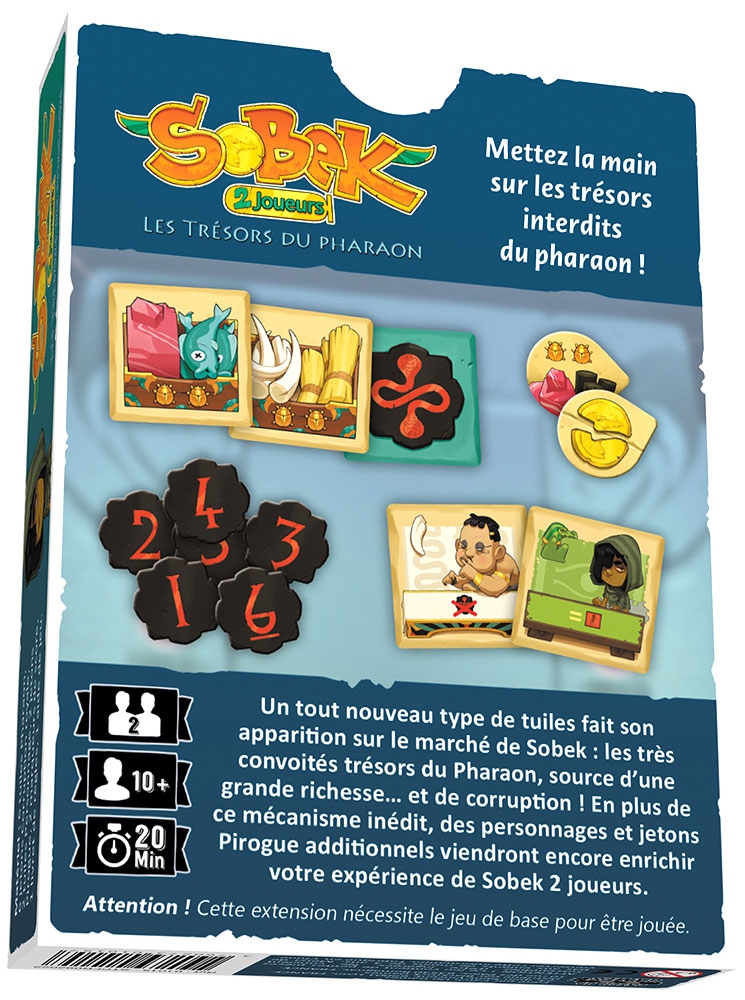 Il y a un an, Sobek est revenu sur les étals, pour une seconde vie, cette fois-ci dans une version spécifiquement conçue pour deux joueurs. Le jeu continue à tenir une belle place sur les étals des boutiques, et est très régulièrement joué sur le plateforme https://boardgamearena.com (plus de 100 000 parties joués au jour où j’écris ces lignes. C’est significatif, non ?)