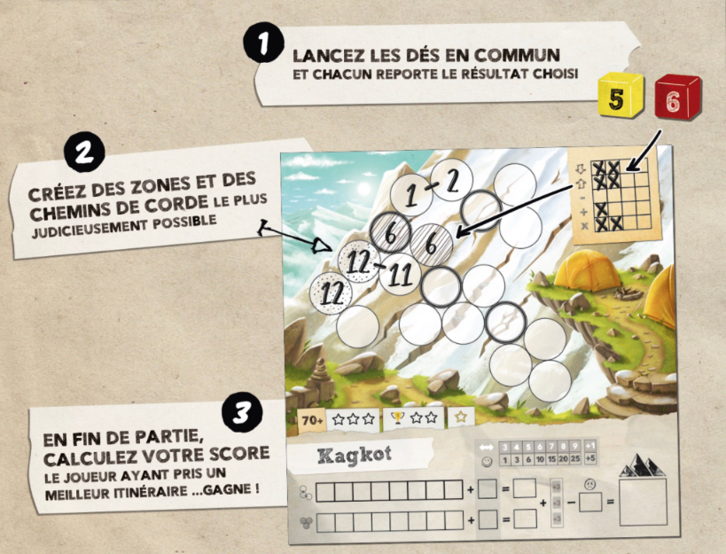 À chaque tour, un joueur va lancer les dés, et chacun, simultanément, va choisir une opération de base (Min / Max / différence / somme / multiplication) dans son petit tableau en haut à droite de sa fiche pour remplir une case de son ascension, en tentant judicieusement de créer des chemins de cordes (suite de nombre croissants qui se suivent), ou des zones (cases adjacentes de même valeur).