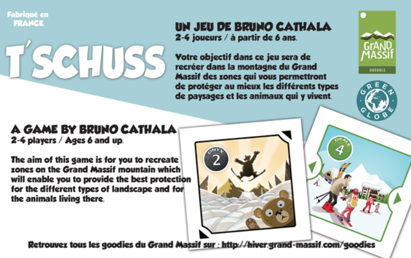 T’SCHUSS est un jeu de commande à l’intention de Grand Massif Domaines Skiables. Ce jeu sa été offert aux caisses des stations de ski du Grand Massif, à toutes les familles qui achètent un forfait semaine, lors de la saison 2019-2020. Il doit aussi être possible de se le procurer à ces mêmes caisses pour une dizaine d’euros. Peut être même qu’en leur envoyant un gentil mail…