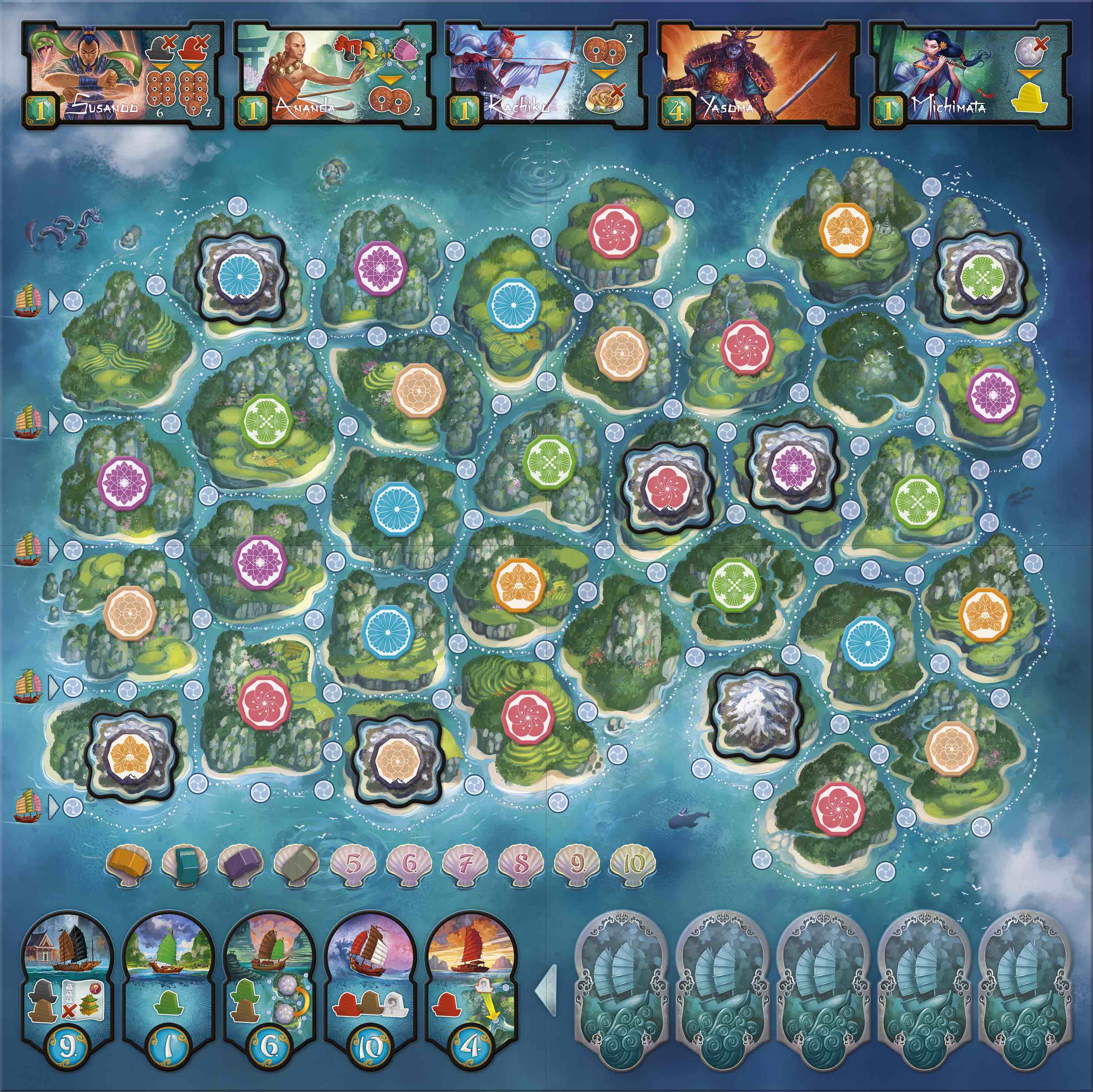 - De l’ambiance ludique elle-même: Dans Yamatai, il faut construire une ville. Lors de son tour, un joueur va choisir une flotte, lui donnant accès à des bateaux transportants différents matériaux. Il va ensuite acheminer ses bateaux sur le plateau, avec des règles de poses très simples, mais amenant quelques subtilités. Ces bateaux vont alors lui permettre, soit de défricher des îles, lui permettant de récupérer de précieuses ressources nécessaires au recrutement de puissants spécialistes, soit de construire un bâtiment pour peu que les matériaux nécessaires soient présent autour d’une île défrichée.